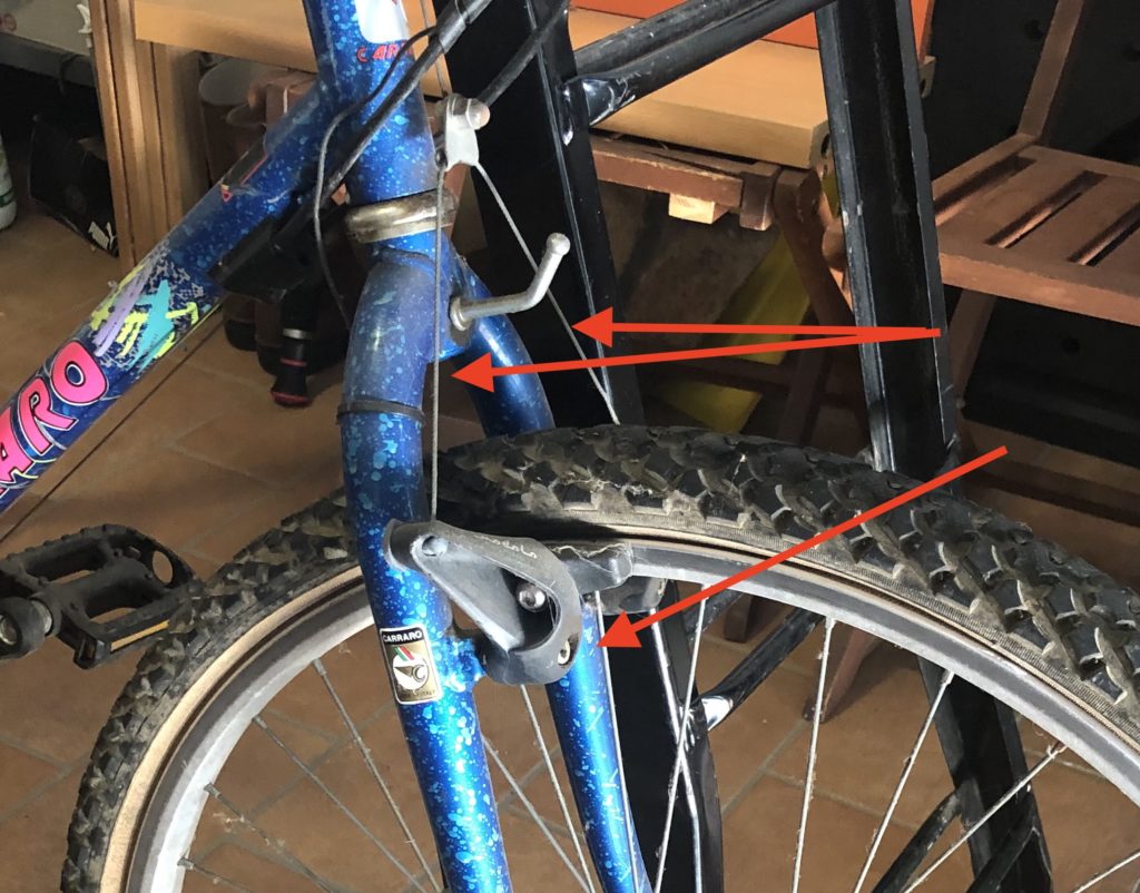 Dobbiamo quindi smontare le pinze dei tacchetti. Questa operazione dipende dalla tipologia del freno. Nello specifico, ho sganciato il cavo che fa da ponte tra i due tacchetti e svitato la vite esagonale che li blocca sulla forcella.