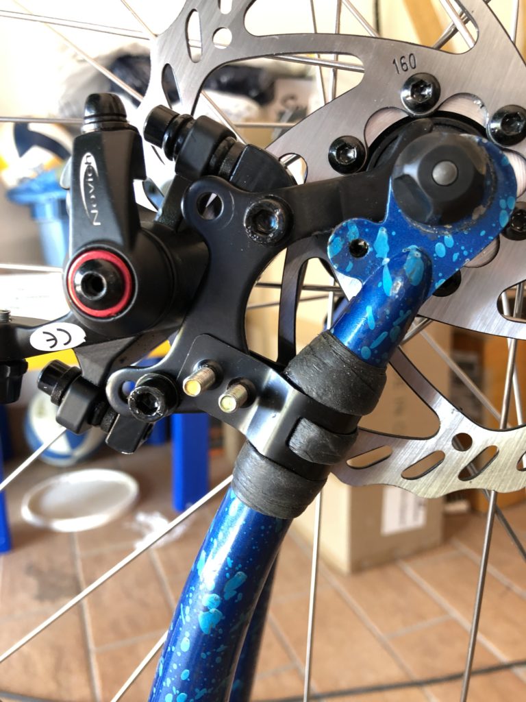 Primo problema: la nuova ruota motorizzata ha la predisposizione per il freno a disco, ma non il disco. Da cui sicuramente il kit dei freni a disco (che comprende 2 dischi e 2 pinze) è da comprare. Inoltre la ruota anteriore, essendo, diciamo, datata, ha il copertone usurato e non ammette il freno a disco. Quindi penso che si debba cambiare prendendone una nuova con la predisposizione al disco.